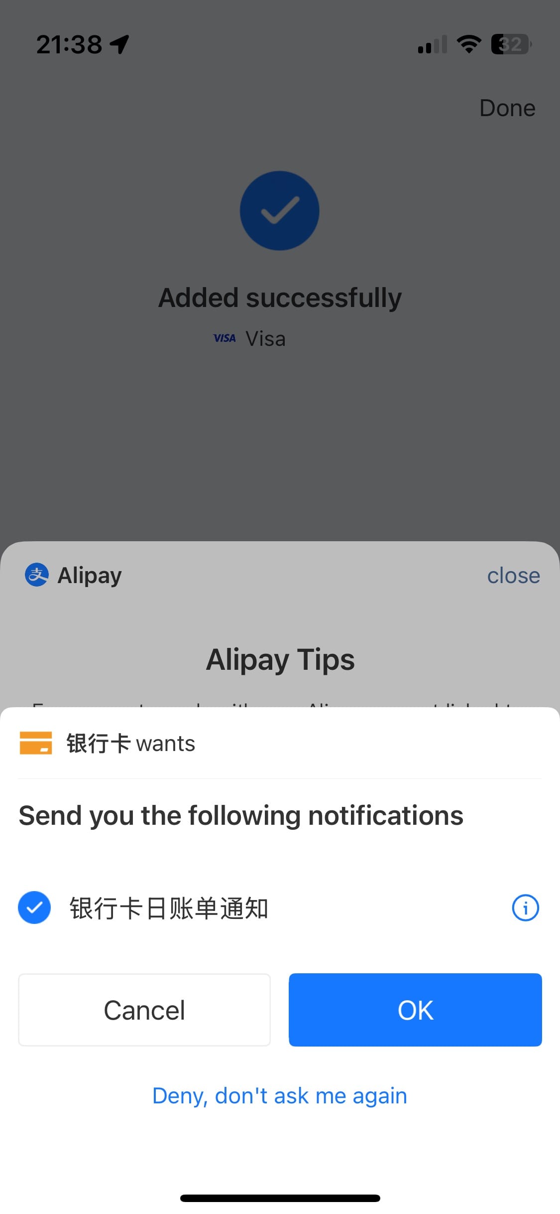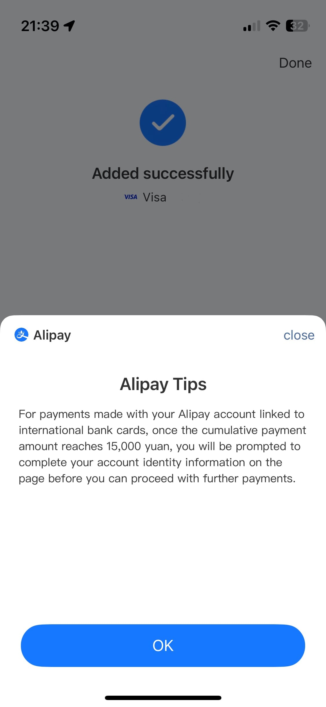 A: Up to 15,000 RMB you donโt need to do an ID check โ it is enough to add your international card. However, above that limit you will have to complete an ID check and you are good to go again.