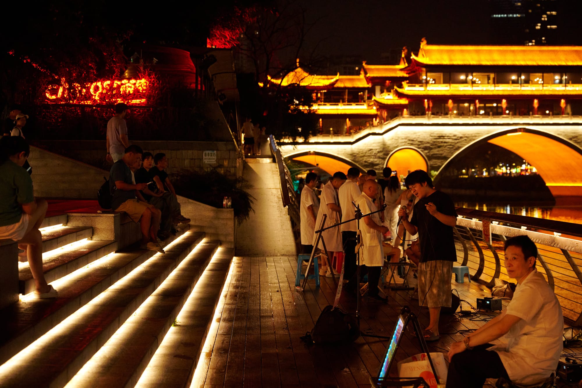 Beautiful illuminated covered bridge over the Jin River — one of Chengdu's most photographed night spots. The surrounding area has a lively bar/restaurant strip along the riverbank. Good for an evening walk after dinner.